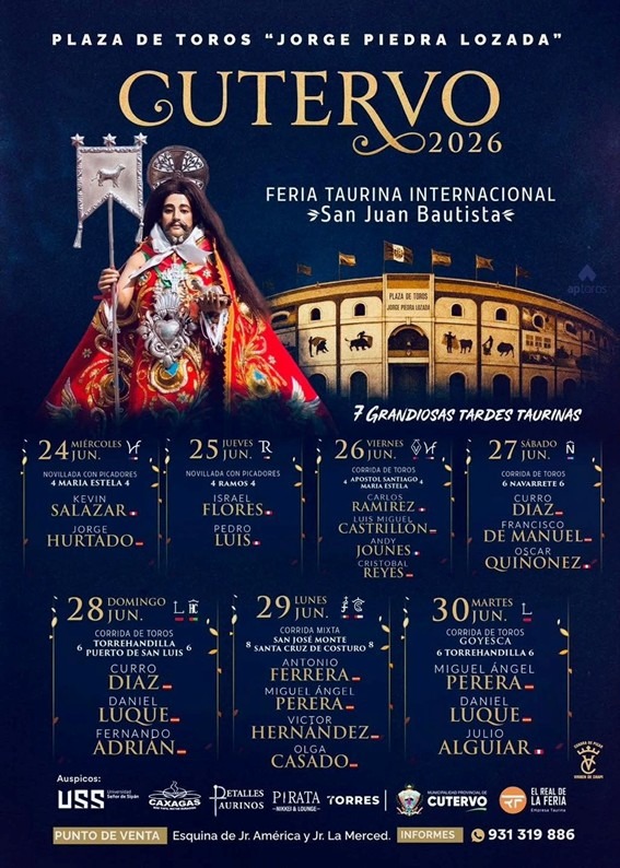OTROS: Repite Fernando Adrián, vuelve Ferrera, la fina manera de Andy Younes, destacó en Huamachuco 2025, el clasicismo de Curro Díaz y, entre otros, la presencia mediática de Olga Casado. Ferias de las que no existen combinaciones aún: QUICACHA: Ahora en feria 4 y 5 mayo, esa empresa asesora la organización de Carlos Rodríguez, anuncian algunas coincidencias: F. Adrián, Pedro Lis, Ferrera, a más de Escribano y Colombo, de ganado se sabe que va San José del Monte. PUQUIO: 16 y 17 mayo, misma empresa mismos toreros debut peruano de O. Casado, Diaz y por delante Colombo que no arregló con la empresa por Cutervo.
