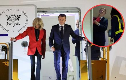 Las imágenes captadas por Associated Press muestran el tenso momento cuando, al abrirse la puerta del avión presidencial, la primera dama vestida de rojo realiza un gesto brusco hacia el mandatario francés.