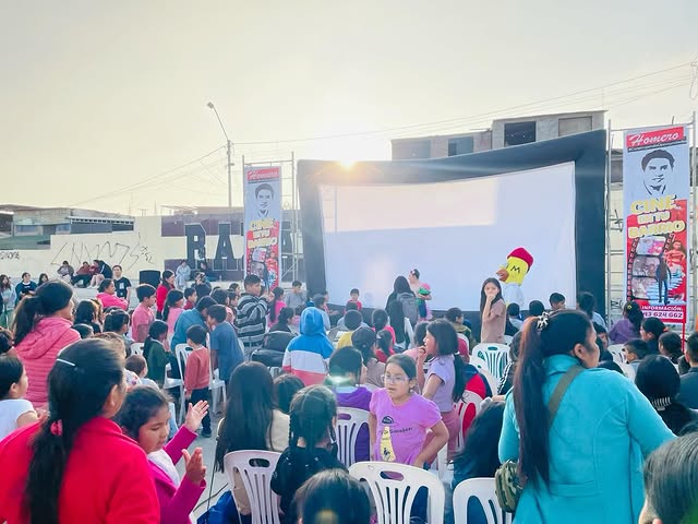 Villa El Salvador.– Cuando cae la noche y las luces se apagan, una gran pantalla se enciende en medio de una losa deportiva. Pequeños y grandes se acomodan en sus sillas con canchita en la mano y una sonrisa en el rostro. No están en un cine comercial, pero la emoción es la misma —o quizá mayor—, porque el cine llegó al barrio, y lo hizo gracias a una iniciativa que desde hace años viene sembrando alegría en cada rincón del distrito.