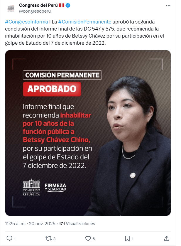 Con la aprobación del informe, el proceso ingresa ahora a su etapa final: será el pleno del Congreso el que decida si procede la sanción política planteada. De obtener luz verde, Chávez quedaría impedida de asumir cargos en la administración pública durante una década.