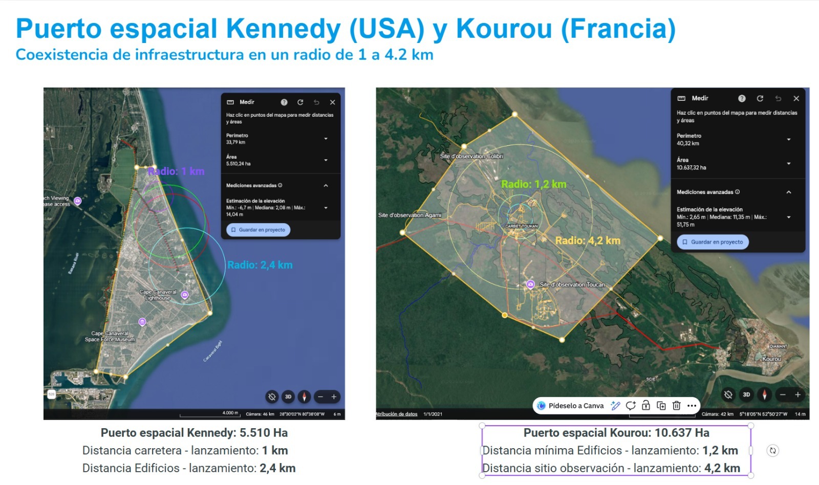 Datos internacionales muestran que Cabo Kennedy, en Estados Unidos, ocupa 5.500 hectáreas, y la base de Kourou, en la Guayana Francesa, 10.000 hectáreas; en comparación, el Estado peruano administra más de 26.000 hectáreas en Lambayeque, lo que lleva a preguntarse si resulta necesario reservar un área que supera en más de cuatro veces la extensión de Cabo Kennedy, cuando el parque eólico ocuparía menos del 1% del terreno disponible.