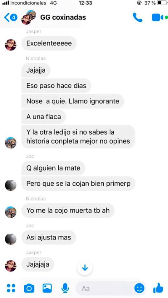 “Ella me hizo llegar una serie de capturas de pantalla de conversaciones entre ellos, en los cuales se referían a mí de la manera más asquerosa que puedan imaginar. Decían en este chat que me violarían, que me maten y que luego de matarme pretendían ultrajar mi cuerpo porque el cuerpo post mortem ajustaba más. Así de grave y retorcido. Obviamente esto me afectó de sobremanera. Cabe resaltar que estos tres sujetos solo son conocidos, es decir me los he cruzado en los pasillos, nunca hemos sido amigos, casi nunca hemos mantenido una conversación, así que el hecho que ellos se refieran de mi es aún más espeluznante”, escribió.