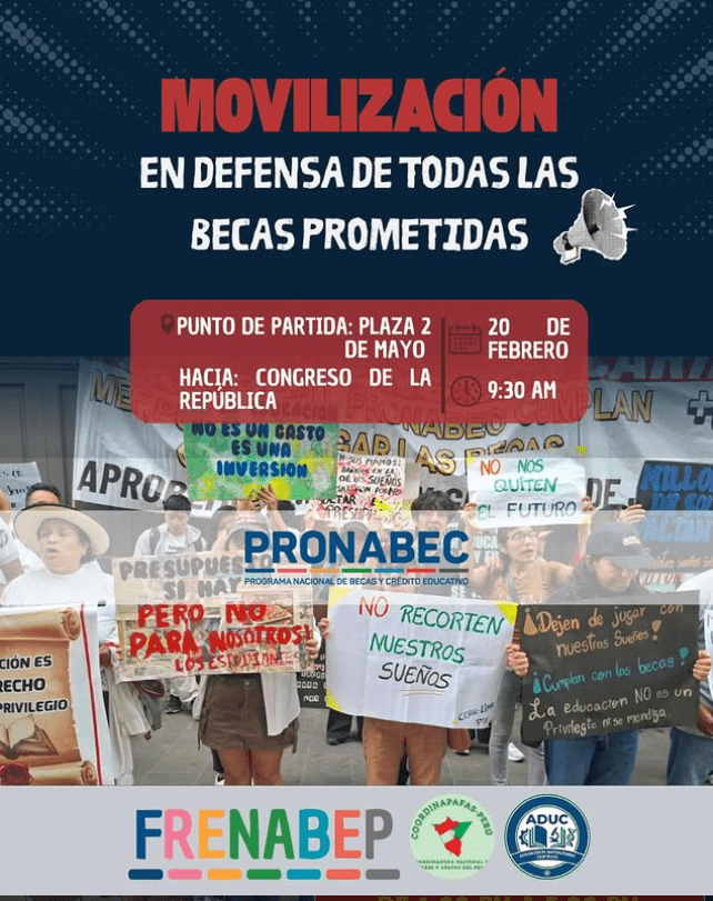 La movilización por la Beca 18 se realizará el 20 de febrero en la Plaza Dos de Mayo desde las 9:30 a.m., en coordinación con COORDINAPAFAS y ADUC.