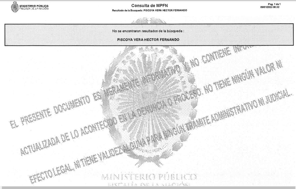 “Mi persona no pertenece ni está vinculada con ninguna actividad delictiva, ni mucho menos me han investigado por pertenecer a ninguna organización criminal o mafia”, abundó. Al mismo tiempo adjuntó un documento de verificación del Ministerio Público que confirma que no posee investigación alguna.