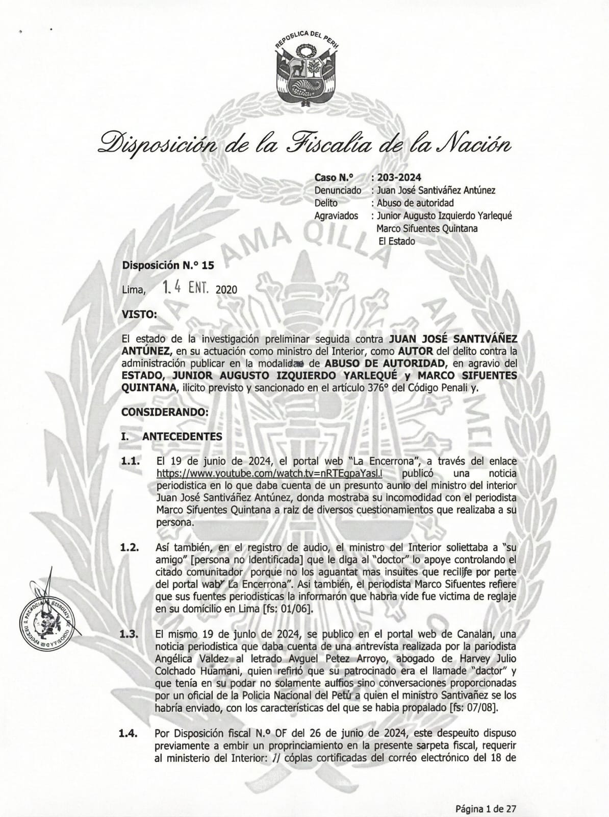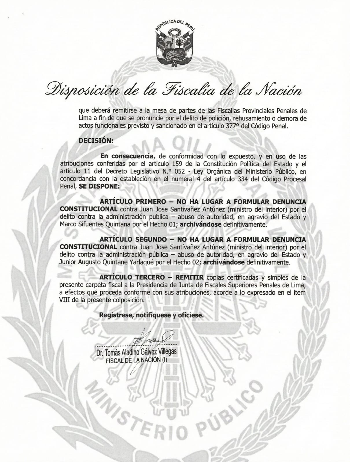 Tras varios meses de indagación, la Fiscalía de la Nación dispuso “no ha lugar a formular denuncia constitucional contra Juan José Santiváñez Antúnez (ministro del interior) por el delito contra la administración pública – abuso de autoridad, en agravio del Estado y Marco Sifuentes”.