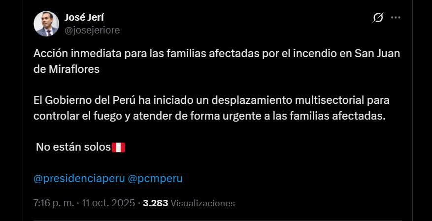 A causa del incendio de gran magnitud ocurrido la tarde de este sábado en Pamplona Alta, el presidente de la República, José Jerí, informó que el Gobierno del Perú ha puesto en marcha una acción inmediata de respuesta para apoyar a las familias damnificadas.