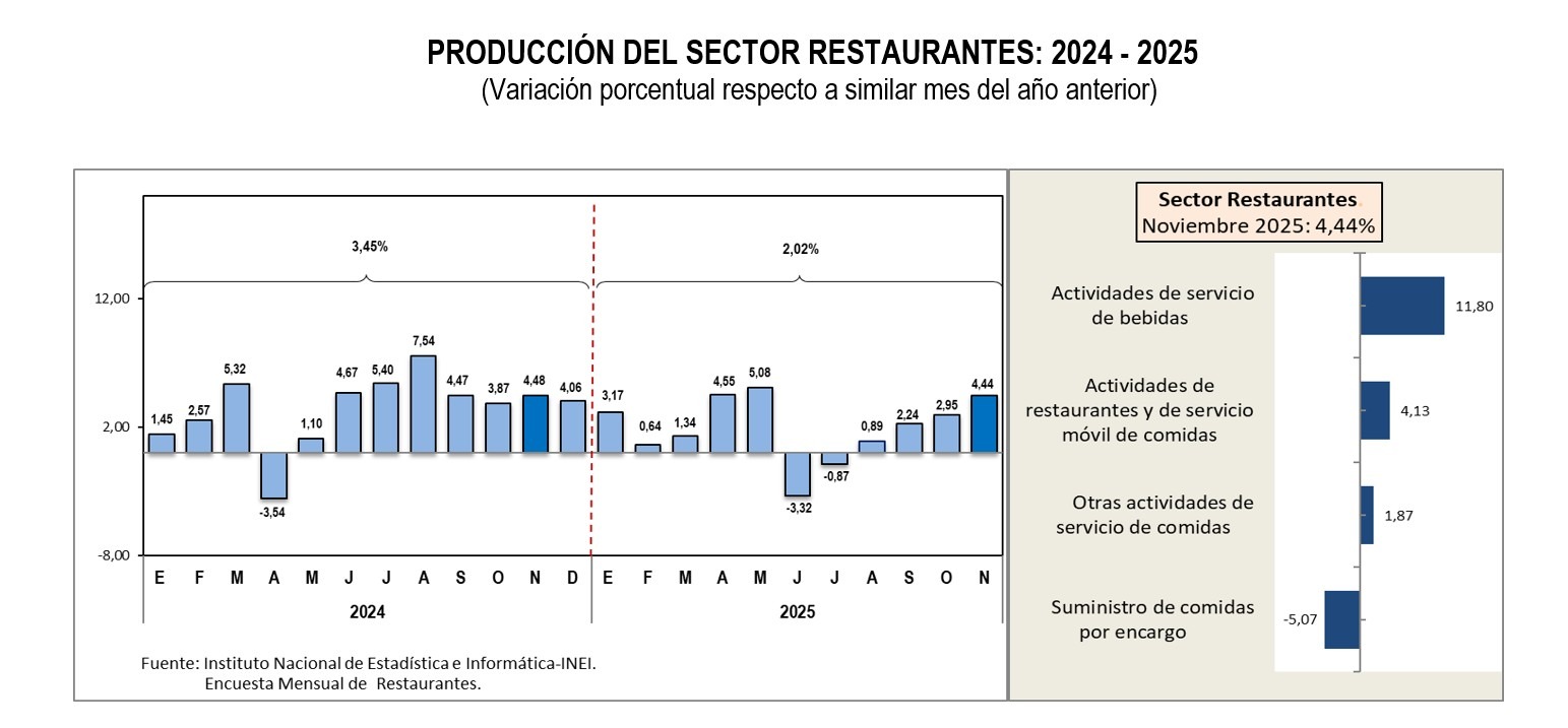 Durante noviembre de 2025, la actividad de restaurantes (servicios de comidas y bebidas) mostró incremento de 4,44%, respecto a similar mes del año anterior, como resultado de la evolución positiva del grupo de restaurantes, servicio de bebidas y otras actividades de servicio de comidas; en tanto, disminuyó el suministro de comidas por encargo.