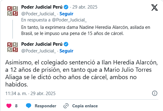 Actualmente, el Ministerio Público coordina con organismos internacionales para concretar la detención de Ilan Heredia en el extranjero y gestionar su extradición al Perú, a fin de que cumpla la pena impuesta por la justicia peruana.