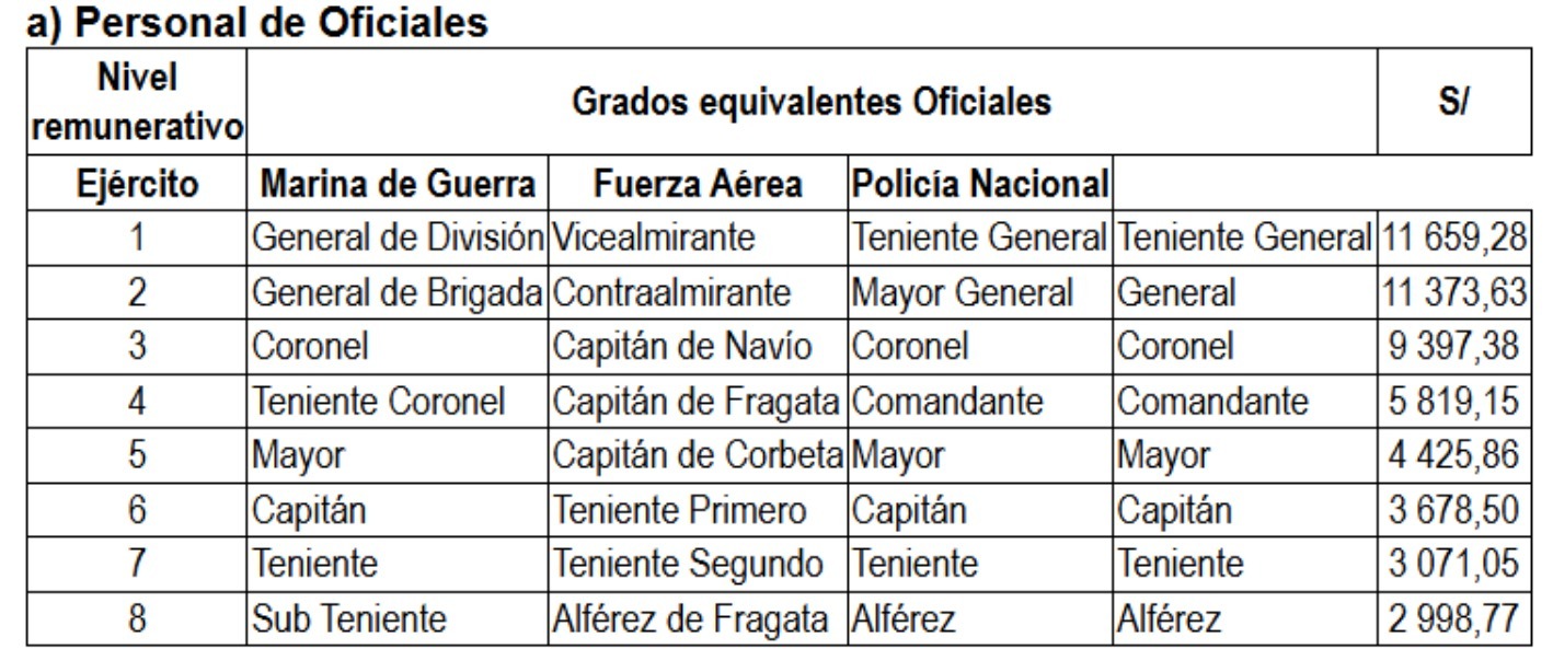 En los grados más altos, los Generales de División, Vicealmirantes y Tenientes Generales percibirán S/ 11.659,28.